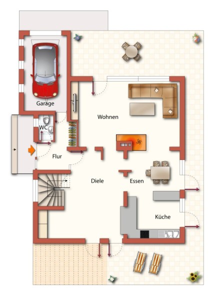 Das Haus verfügt über eine integrierte Garage mit elektrischem Tor, welche direkten Zugang zum Eingangsflur des Hauses bietet. Ein optisch ansprechender Carport ist zusätzlich vorhanden. Die Auffahrt ist über ein per Funk steuerbares Tor vom öffentlichen Bereich abgegrenzt. Das gesamte Eckgrundstück ist mit einer versetzten Mauer im Wechsel mit einer gut gewachsenen Hecke eingefriedet. Die an der Süd-, West- und Ostseite umlaufende Terrasse liegt etwas höher als die das Grundstück prägenden Rasenflächen und ist an verschiedenen Stellen über einige Stufen zu betreten. Auf der Terrassen-Westseite wurde 2017 ein Glasdach mit seitlicher Begrenzung installiert. Eine elektrische Markise sorgt an sonnigen Tagen für ein schattiges Plätzchen. Zum Abstellen von Gartenmöbeln und -geräten ist ein Gartenhäuschen vorhanden.